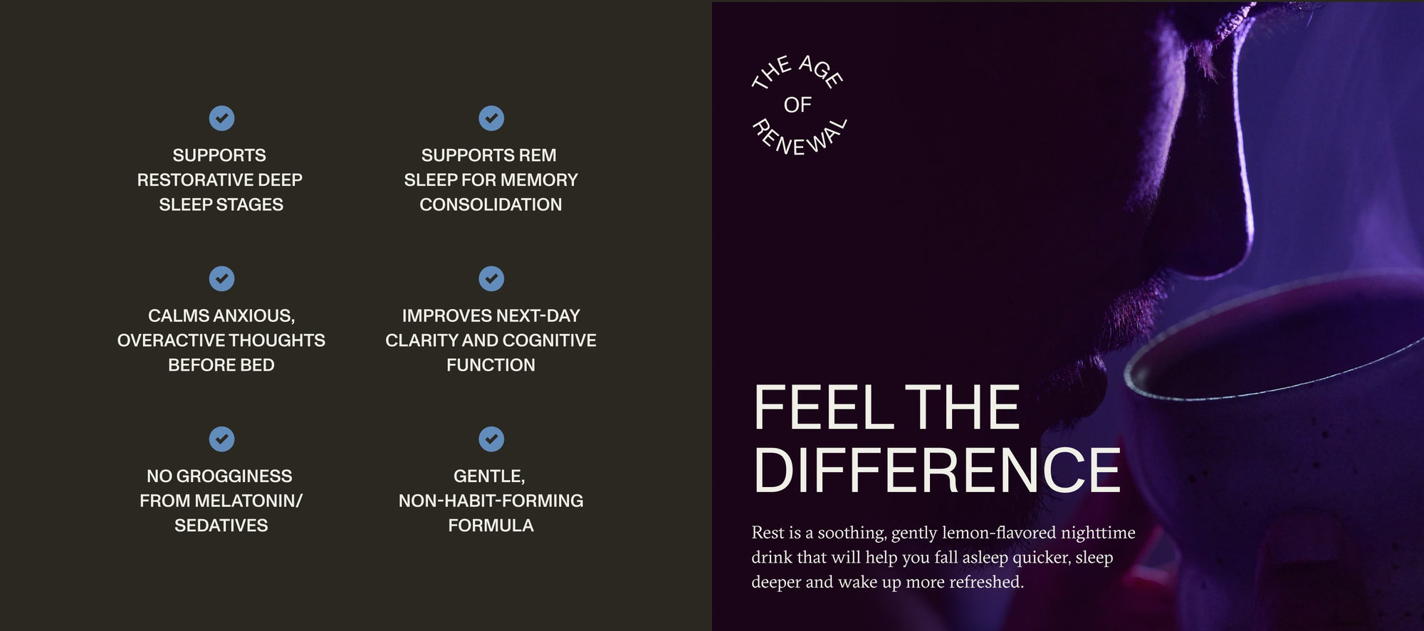 Rest takes a different approach by focusing on minerals and amino acids that work with our biology to support the brain’s natural sleep rhythms, helping you transition into Deep and REM sleep stages faster and stay in them longer.